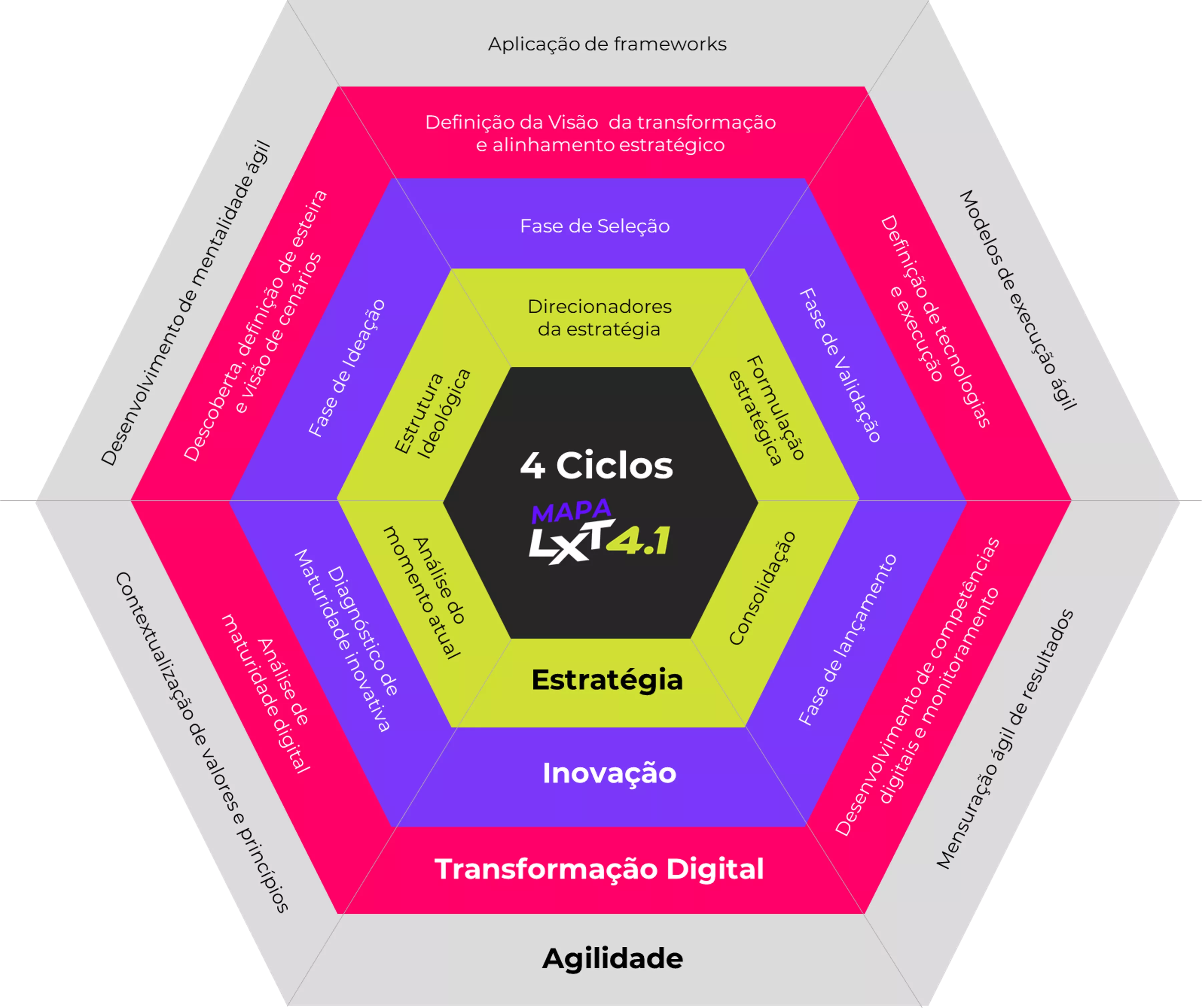 Nosso MAPA LXT une 4 pilares com suas fases que potencializam resultados em todas as esferas baseados em mais de 65 ferramentas práticas.